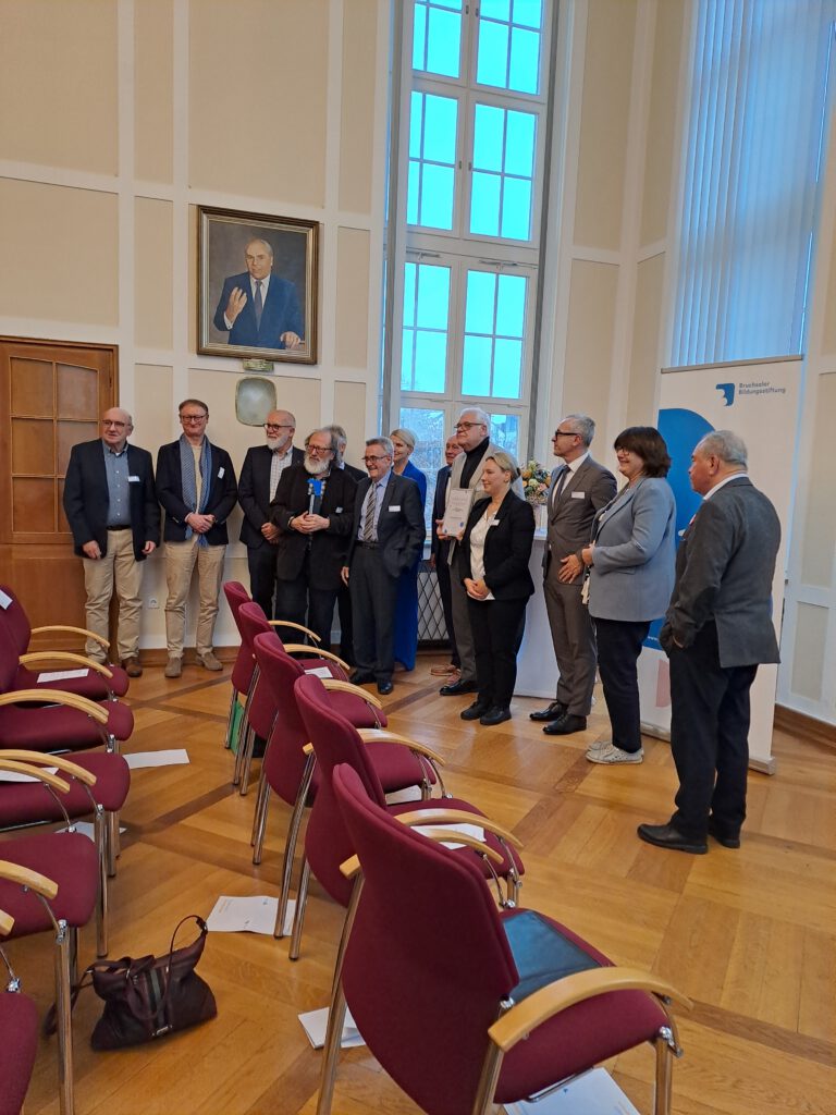 Eine ganz besondere Ehrung erhielt unser Förderverein „Demokratiegeschichte Bruchsal“ e.V. am 28. November 2025 in einem kleinen Festakt im Sitzungssaal des Bruchsaler Rathauses von der Bruchsaler Bildungsstiftung als Anerkennung für unsere jahrelange Erinnerungsarbeit in Sachen Demokratisierung Deutschlands am Beispiel der Stadt Bruchsal und dies in Anwesenheit von Vertretern aus Politik und Verwaltung, an ihrer Spitze Oberbürgermeister Sven Weigt und die früheren Stadtoberhäupter Cornelia Petzold-Schick und Bernd Doll. Diese Auszeichnung, überreicht vom Vorsitzenden der Stiftung Hans-Jörg Betz, ist uns vor allem eine Motivation für besondere Veranstaltungen im nächsten Jahr, wenn am 18. März 2026 der bundesweite „Gedenktag Demokratiegeschichte“ unter der Schirmherrschaft des Bundespräsidenten stattfindet. Geplant ist dann eine besondere Dokumentation von Bruchsaler Protagonisten dieses Teils der deutschen Geschichte und eine Ausstellung von Informations-Plakaten dazu, das alles in Zusammenarbeit mit der Sparkasse Kraichgau und in deren Räumen. Dazu spezielle Stadtführungen zu diesem Thema an den Folgetagen und online über diese Webseite.