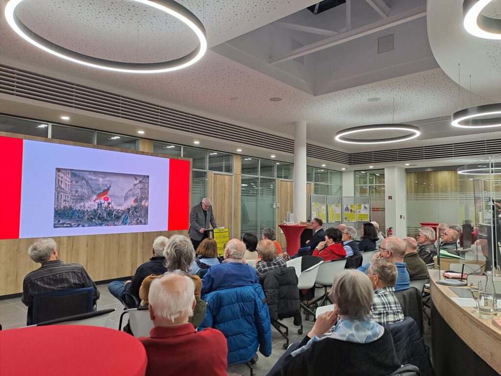 Am ersten bundesweiten „Tag der Demokratiegeschichte“, ausgerufen von Bundespräsident Frank-Walter Steinmeier, war es in Bruchsal selbstverständlich Aufgabe des Fördervereins „Demokratiegeschichte Bruchsal“, diesen Gedenktag mit einer entsprechenden Veranstaltung zu begehen. Dankenswerterweise stellte die Sparkasse Kraichgau die Schalterhalle ihrer Bruchsaler Filiale in der Friedrichstraße für einen Vortrag und die Eröffnung einer Ausstellung von Informations-Plakaten zu diesem Thema zur Verfügung. Eröffnet wurde die Veranstaltung, die gut besucht war, vom Vorsitzenden der Sparkasse Kraichgau, Norbert Grießhaber. In einem hoch-interessanten Vortrag unter dem Titel „In unsrer sonst so ruhigen Stadt…“ spannte der Bruchsaler Historiker Dr. Dr. Jürgen Dick einen großen historischen Bogen von den Anfängen der bürgerlichen Demokratiebewegungen der Jahre 1848/49 bis zur heutigen Zeit und vor allem zu den notwendigen Themen einer zukunfts-gerechten Erinnerungskultur. Dass gerade die Stadt Bruchsal auf diesem Sektor jede Menge an Protagonisten und Ereignissen aufzuweisen hat wie vielleicht kaum eine andere Stadt unserer Größenordnung, wurde in dem reichhaltig bebilderten Vortrag auf eindrucksvolle Weise präsentiert. Eine historische Zusammenfassung, wie sie in dieser Form in der Stadt wohl noch nie angeboten wurde. Vor allem die Lebensläufe der Bruchsaler Protagonisten dieser Zeit Lorenz Brentano, Amalie Struve, Otto von Corvin-Wiersbitzki, Heinrich Hetterich, Franz Sigel und Peter Lacher vermittelten ein lebhaftes Bild der Ereignisse dieser Jahre. Eingespielte Lieder und historische Text-Lesungen sprachen in der eineinhalbstündigen Geschichts-Lektion auch die Gefühle dieser Zeit an, die ohne jeden Zweifel auch einen großen Einfluss auf die heutige demokratische Verfassung Deutschlands für sich reklamieren kann.